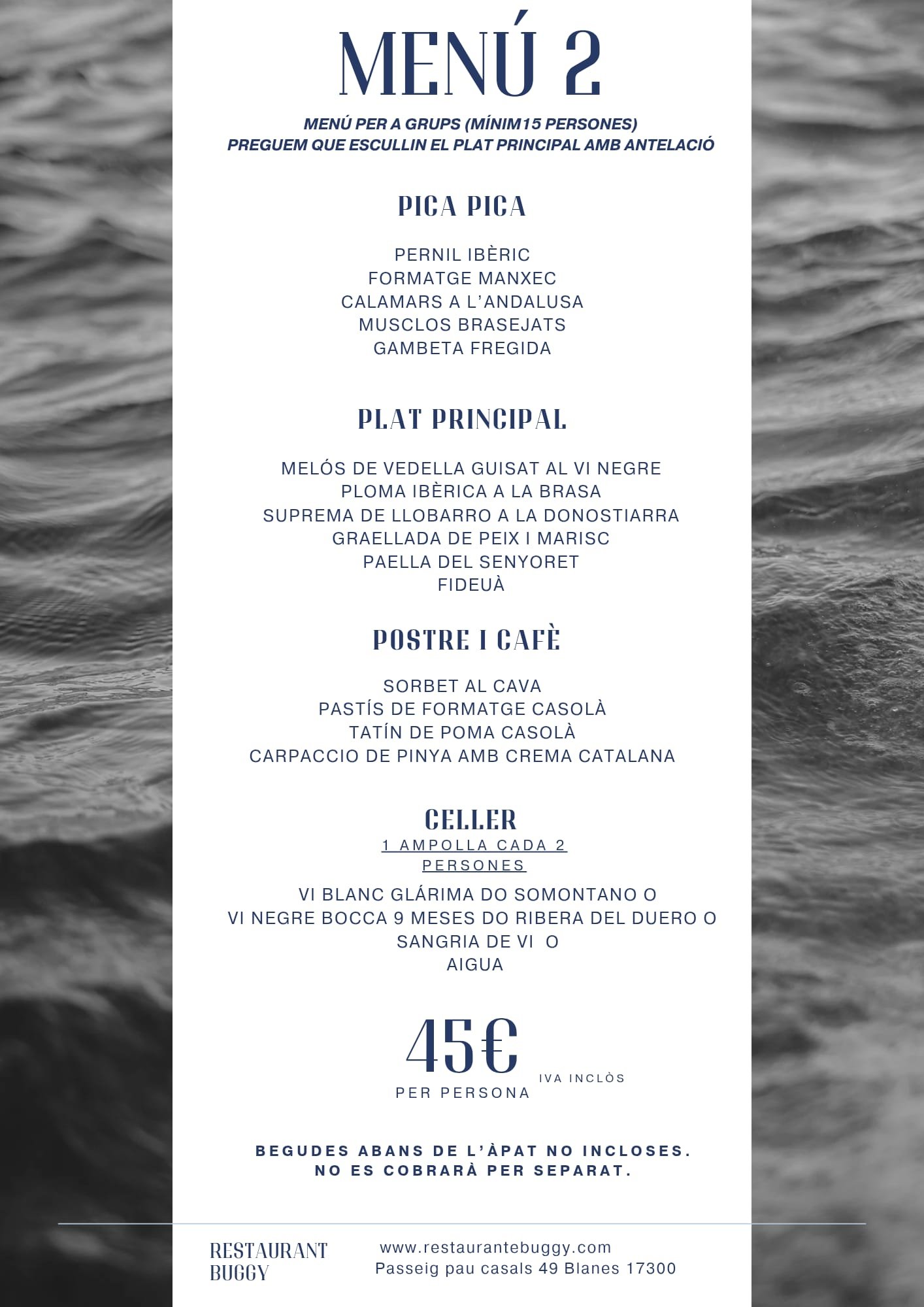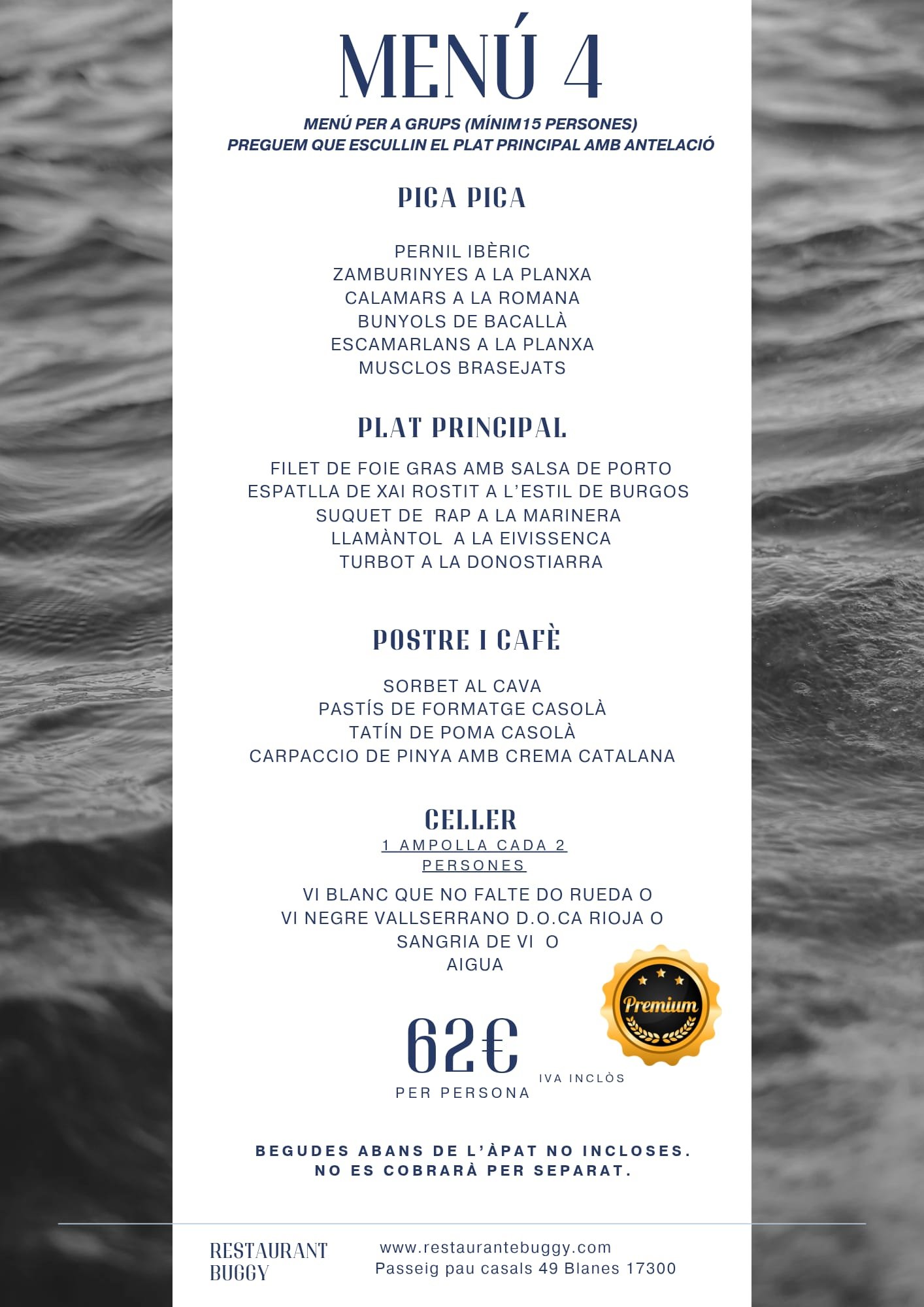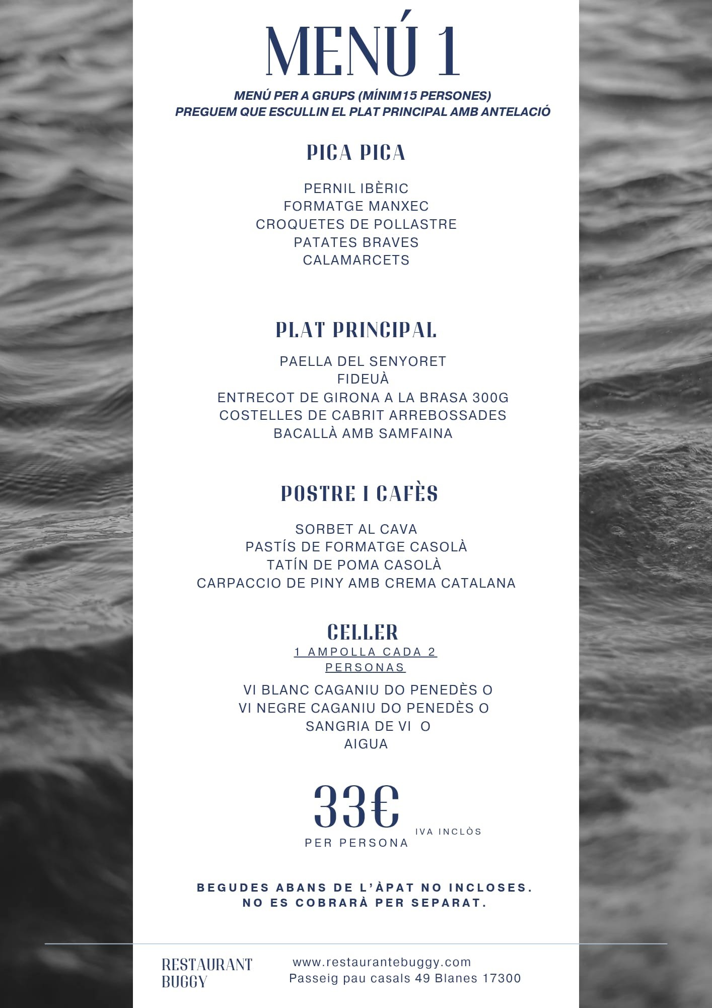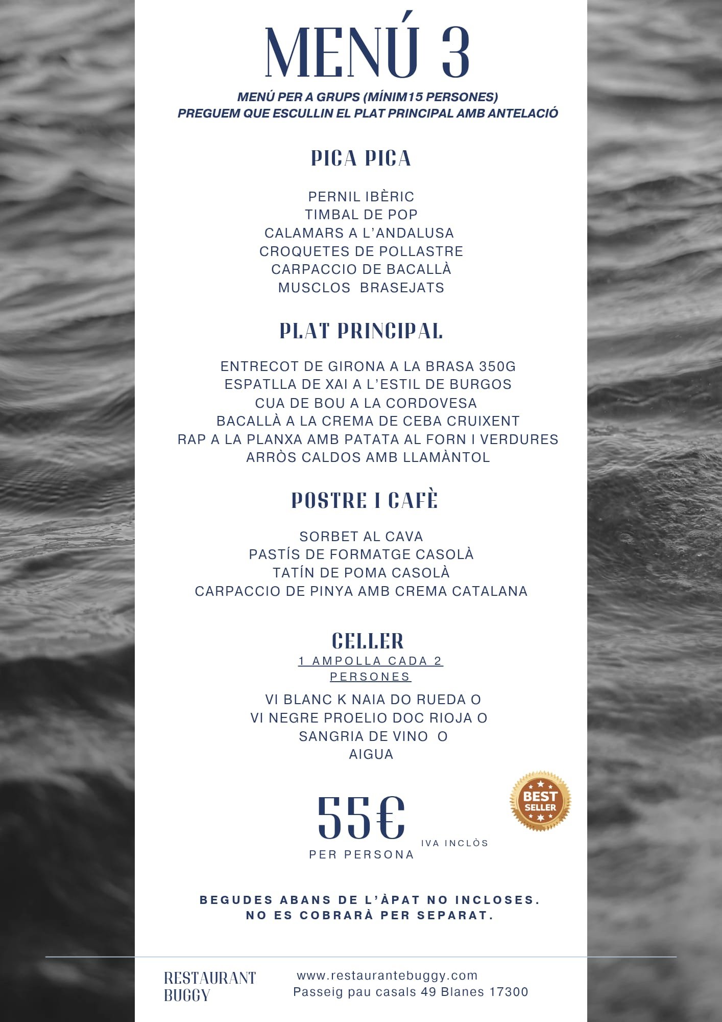 Disposem de cuatre menús especials per a grups dissenyats per gaudir del millor de la nostra cuina. Aquests menús estàn disponibles per a grups de més de 15 persones a un cost des de 33€ per persona .