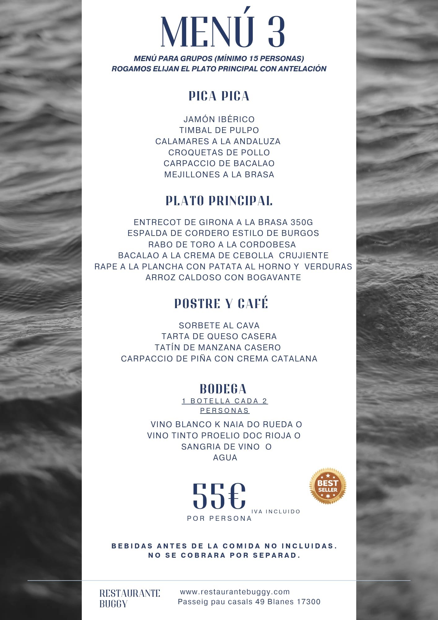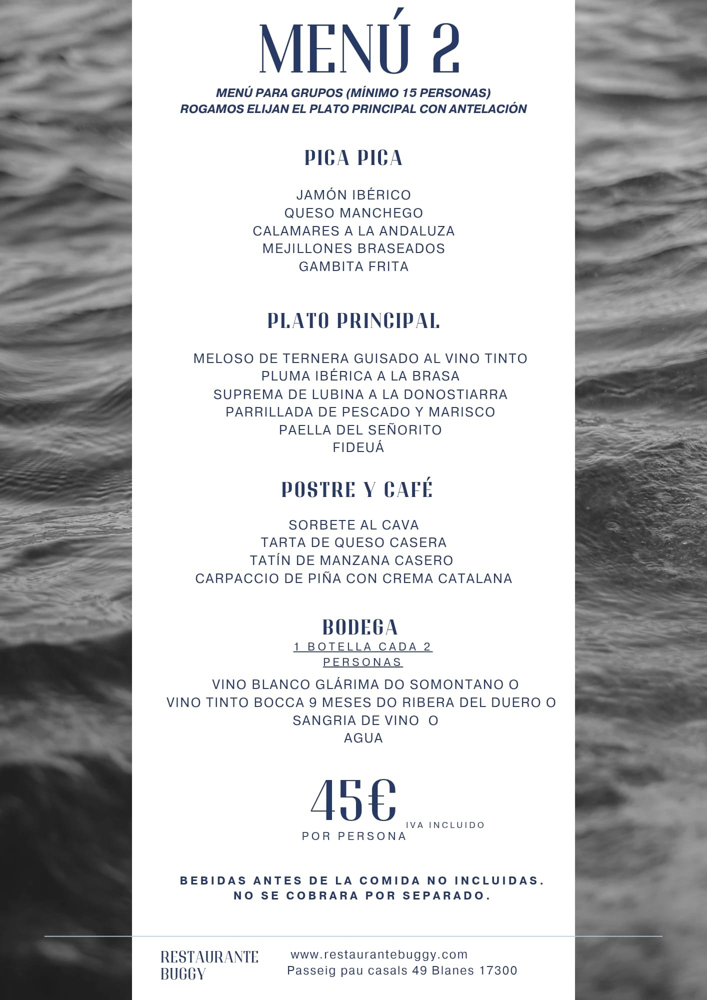 Au Buggy Blanes, situé sur la promenade maritime de Blanes, nous offrons l’espace idéal pour célébrer vos événements spéciaux. Qu’il s’agisse d’une réunion de famille, d’un dîner entre amis ou d’une fête d’entreprise, notre atmosphère chaleureuse et notre proposition gastronomique rendront votre expérience inoubliable.
