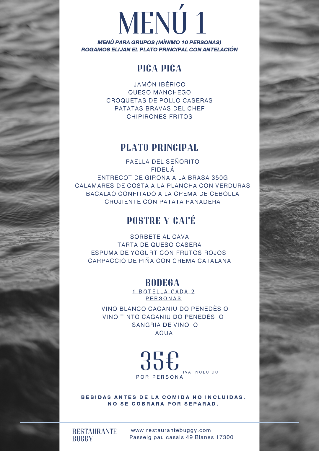 Au Buggy Blanes, situé sur la promenade maritime de Blanes, nous offrons l’espace idéal pour célébrer vos événements spéciaux. Qu’il s’agisse d’une réunion de famille, d’un dîner entre amis ou d’une fête d’entreprise, notre atmosphère chaleureuse et notre proposition gastronomique rendront votre expérience inoubliable.