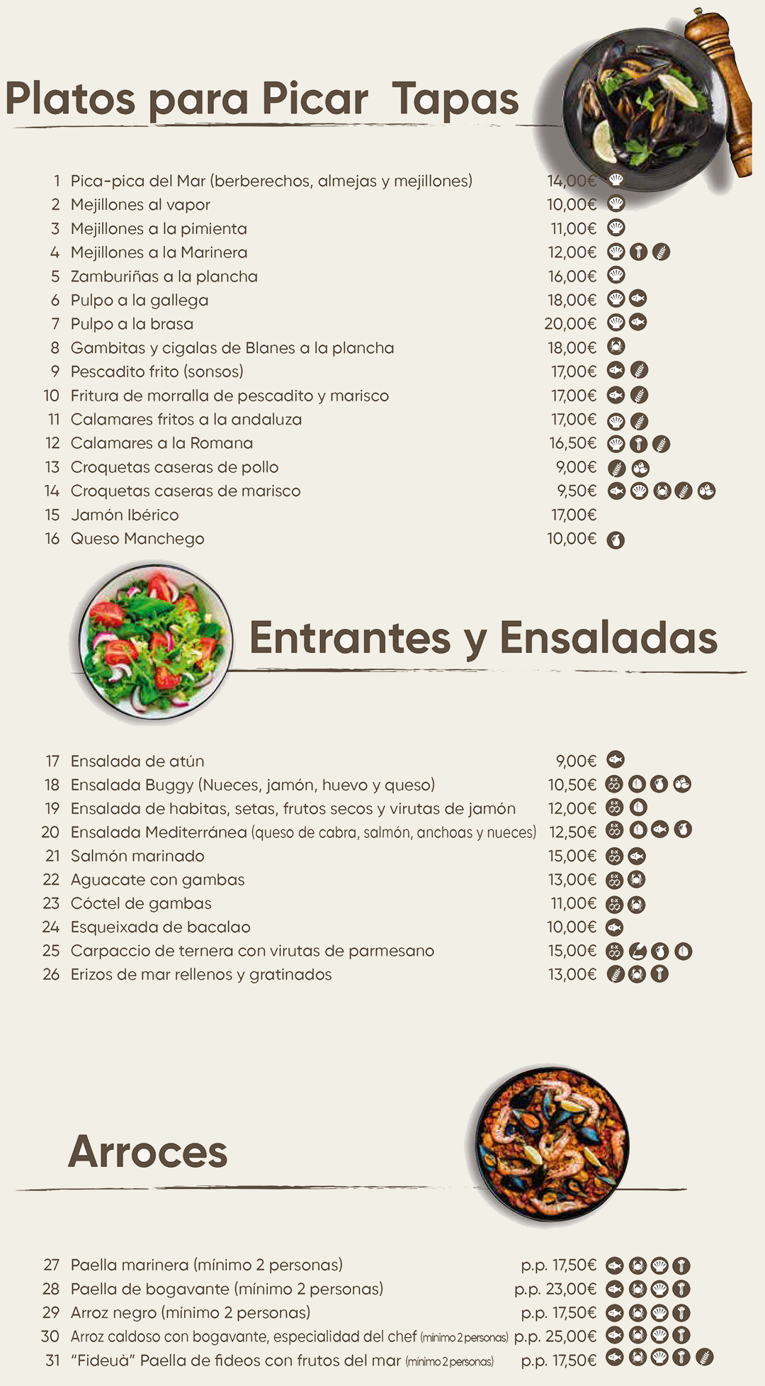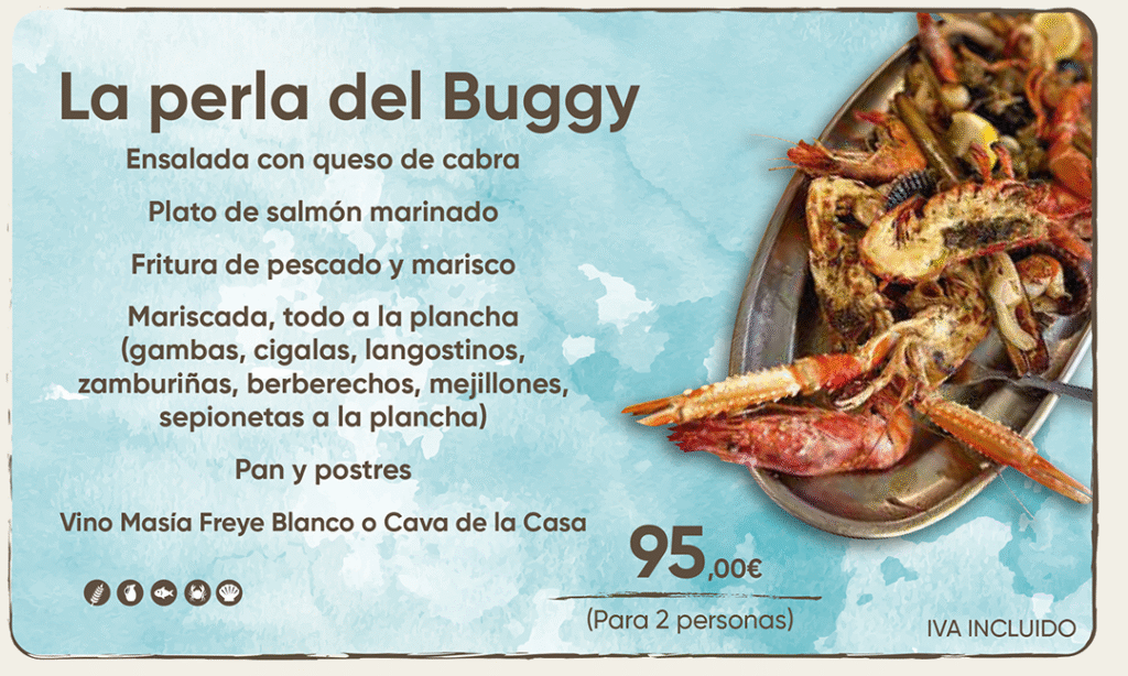 Explora nuestra variada carta de platos, perfecta para compartir o disfrutar en solitario. Te ofrecemos una selección deliciosa de opciones para picar, ensaladas frescas, arroces, carnes, pasta fresca, pizzas, además de pescados y mariscos frescos, sin olvidarnos de la Perla del Buggy ideal para compartir. Cada plato está cuidadosamente preparado con ingredientes de alta calidad para brindarte una experiencia gastronómica. ¡Déjate llevar por la diversidad de sabores y encuentra tu favorito!