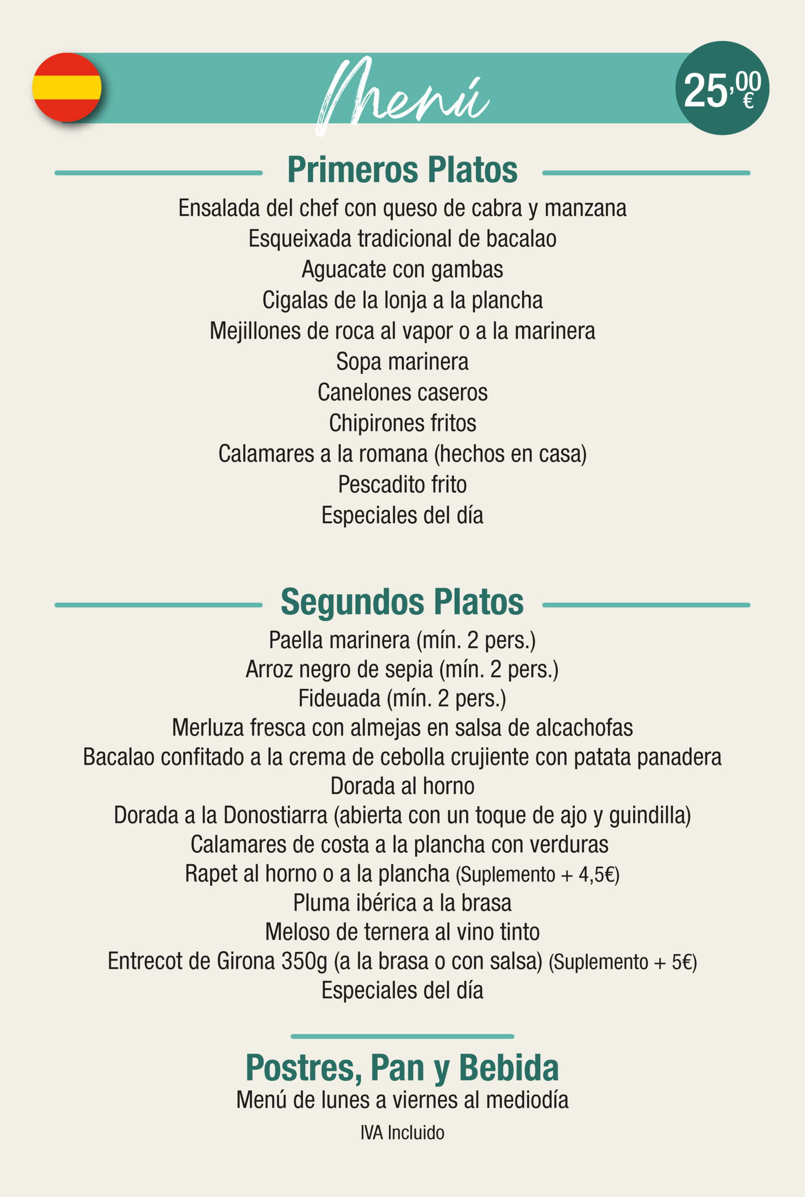 Te invitamos a disfrutar de nuestro exquisito menú diario, disponible de lunes a viernes al mediodía. Cada día, preparamos platos frescos y sabrosos que incluyen una opción de postre, pan y una bebida para completar tu comida.